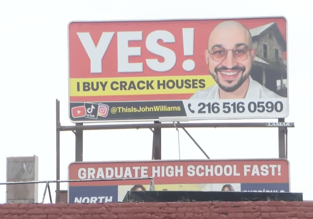 CLEVELAND, Ohio (WOIO) – Billboards stating, “Yes! I buy crack houses” and “Your house is trash? I’ll pay cash” have been appearing around Cleveland recently.